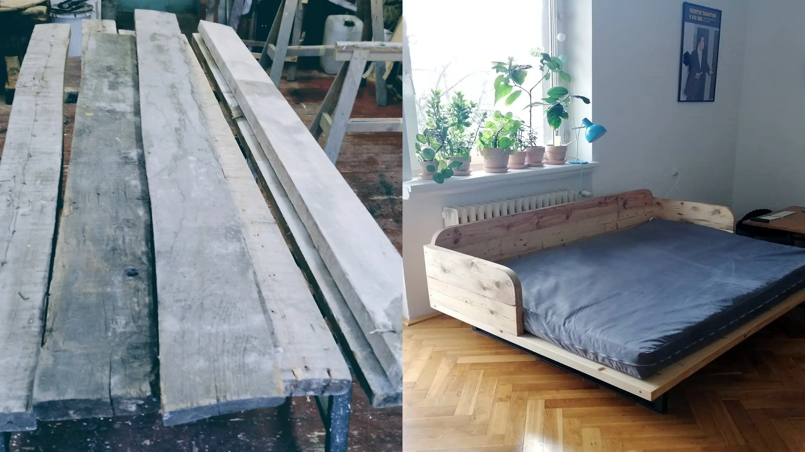 Pohovka pro futon ze 100+ starých borovicových fošen. Lenošení skoro jako v lese. Povrchová úprava přírodní oleje a vosky.